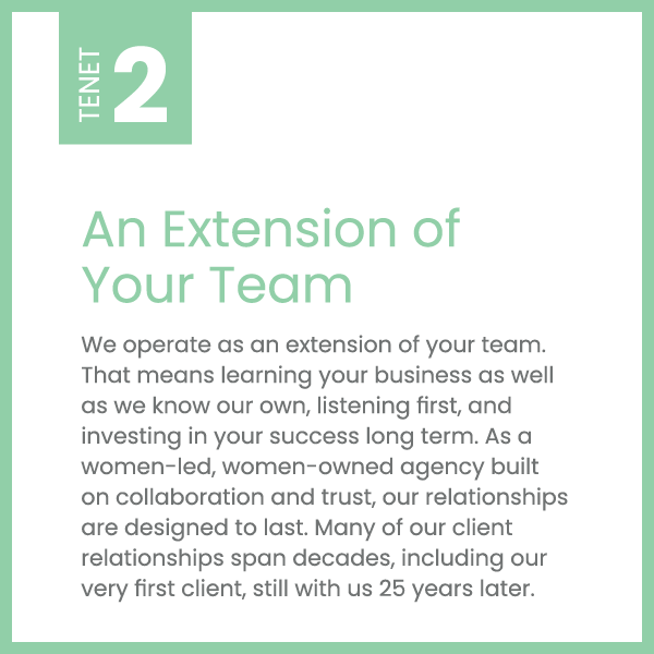 What began as a one-person consultancy has grown into a full-service agency and nationally certified Women’s Business Enterprise, providing integrated capabilities in public relations, creative services, marketing communications, social media, advertising, and media planning & buying.